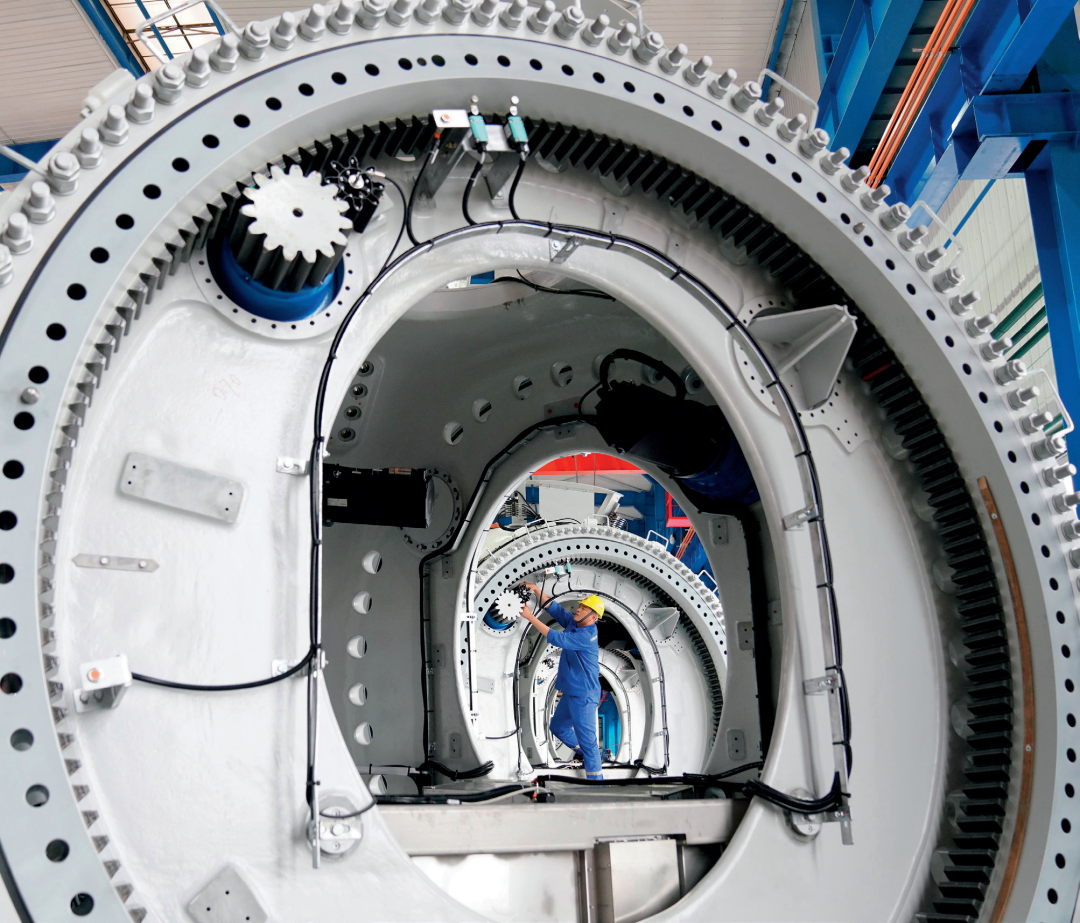 在黑龙江省齐齐哈尔市中国一重集团有限公司风电装备生产制造厂生产车间,工人进行生产作业(2021年7月1日摄)