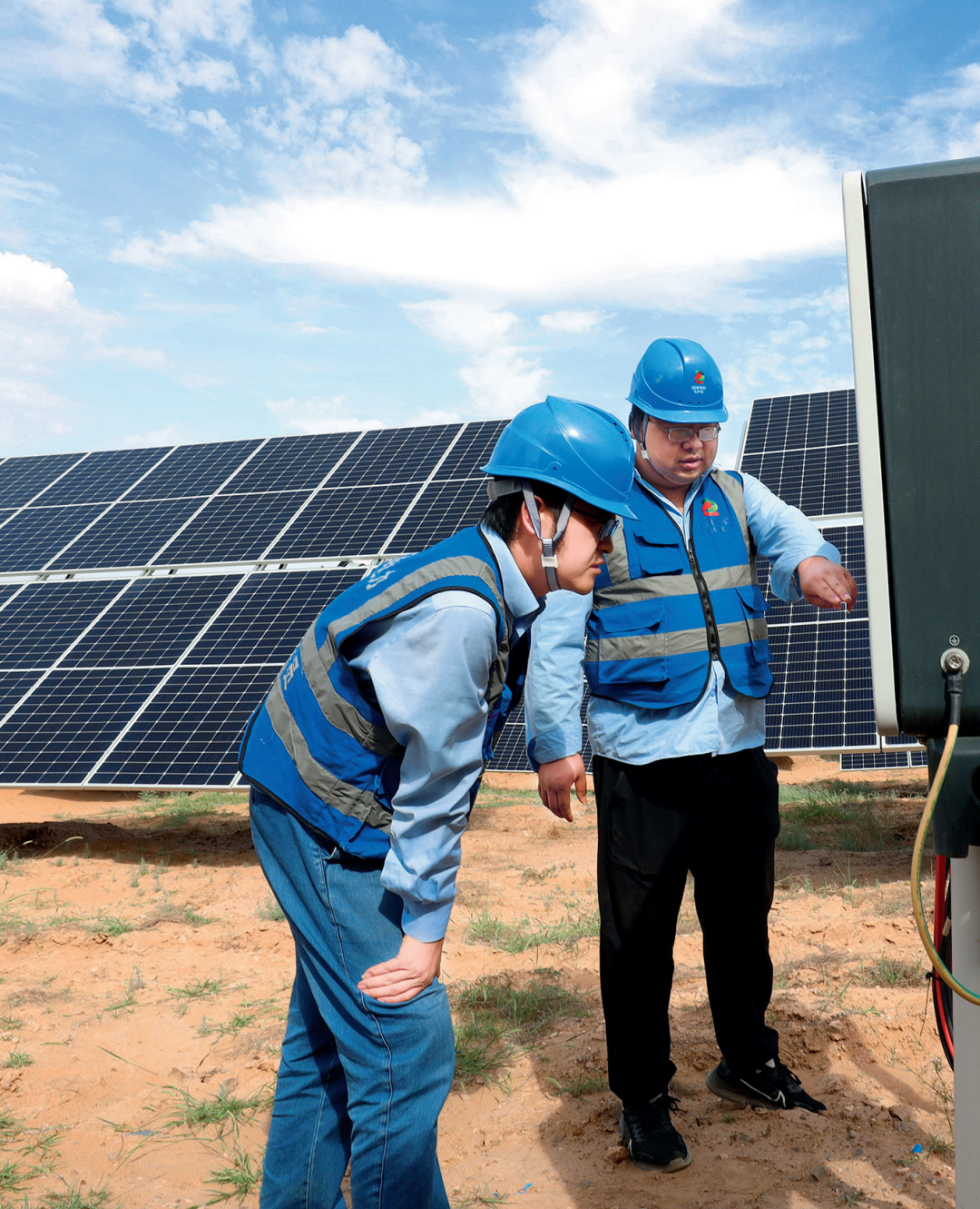 国家电投五凌电力余丁光伏电站职工在检修设备(2022年8月31日摄)