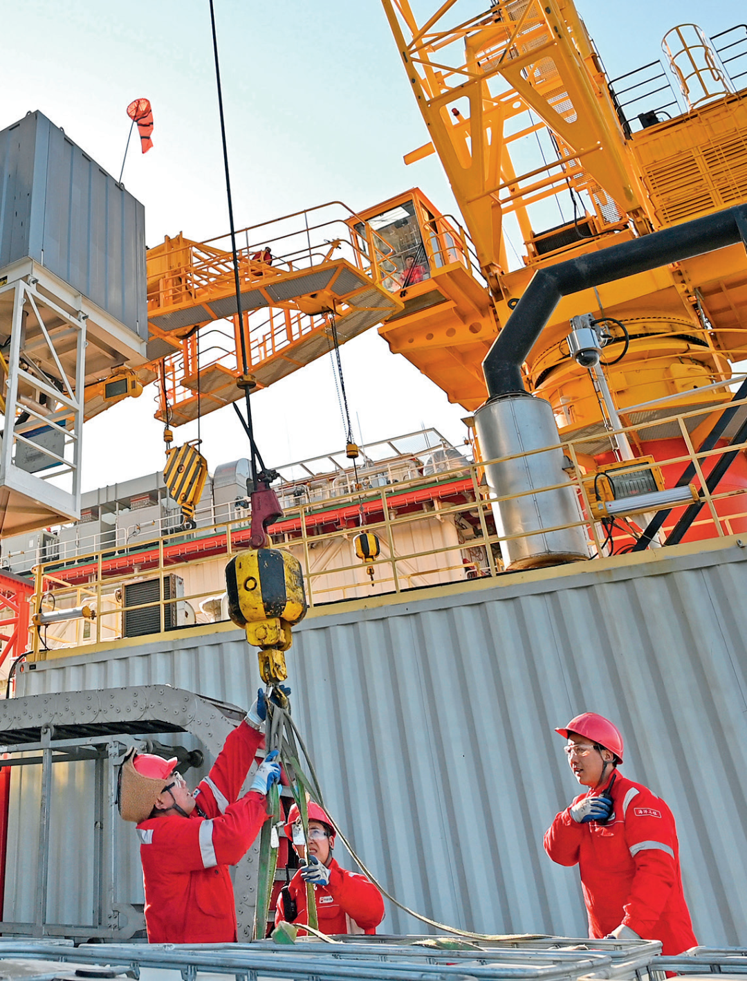 埕海一号海上采油平台工作人员在平台甲板进行吊装作业(2023年1月16日摄)