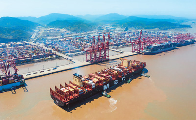 浙江宁波舟山港现有生产泊位620多座,连续14年全球货物吞吐量第一。今年一季度,该港完成货物吞吐量3.31亿吨,同比增长9.14%。图为一艘集装箱船靠泊在宁波舟山港穿山港区集装箱码头。