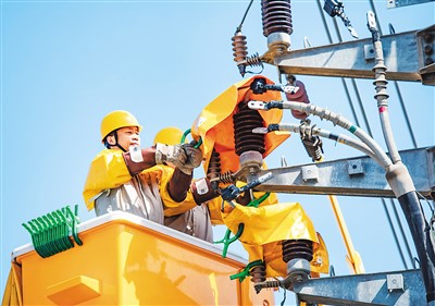 在江苏省连云港市东海县高新技术产业园区,国家电网江苏省电力有限公司东海县供电分公司工作人员正抢修电力线路。