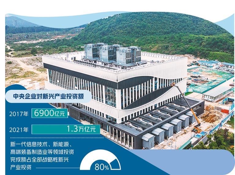 近年来,中央企业持续加大新兴产业布局。《中央企业高质量发展报告(2022)》显示,中央企业发挥国有企业结构调整基金等作用,持续加大新兴产业投入,投资额由2017年的6900亿元增长至2021年的1.3万亿元,年均增长超20%,新一代信息技术、新能源、高端装备制造业等领域投资完成额占全部战略性新兴产业投资的80%。近70家中央企业超过700家子企业在新基建领域加大布局,2021年投资超过4000亿元。