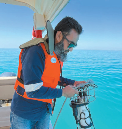 在中国港湾工程有限公司承建的沙特阿拉伯红海开发项目中,工作人员使用水质检测浮标传感器对施工区域内水质进行监测。