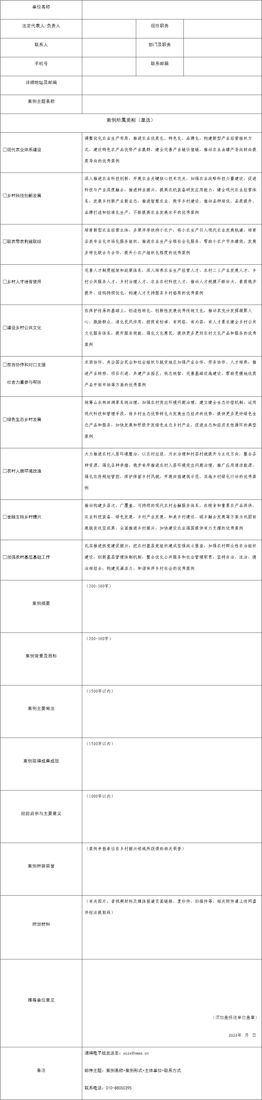 2、案例报送需要认真填写《2023年乡村振兴优秀案例征集表》,投稿无登记表者不予评选;投稿文件(邮件)请以“案例名称+案例形式+主体单位+联系方式”的格式命名。