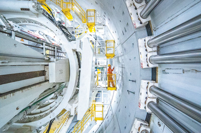 山东青岛胶州湾第二海底隧道工程正在加紧建设,目前盾构机已掘进至海平面下约60米。图为3月18日,中铁十四局的建设者操作“海天号”盾构机进行管片拼装。