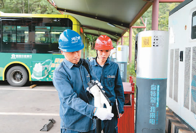近年来,贵州省黔西南州晴隆县坚持绿色低碳发展理念,加快建设覆盖全县的新能源充电设施服务体系,助力群众绿色出行。南方电网晴隆供电局积极推动充电设施与智能电网、智能交通等系统融合发展,目前在全县共建成电动汽车充电站27座,充电桩53个,充电服务能力达1802千瓦。图为该局工作人员对充电站供电设备进行检查。