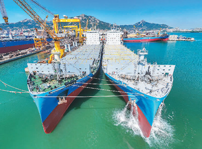 浙江舟山中远海运重工三号船坞内,一段段三四层楼高的船舶结构分段林立,工人穿梭其间,干得热火朝天。“上半年,我们已经交付了10条船,其中包括6.36万吨散货船、15.4万吨穿梭油轮以及2万吨转载驳船等,营收同比增长50%左右。”舟山中远海运重工企划部负责人蒋萍说。