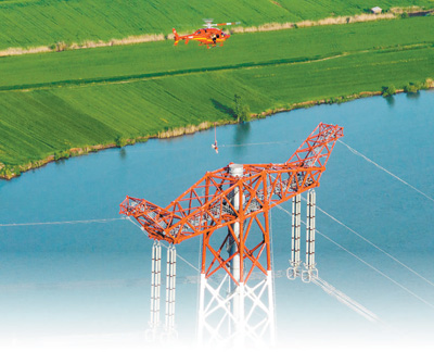 直升机将检修人员送至淮河大跨越输电工程开展检修作业。