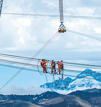 四川甘孜藏族自治州二郎山上,一座座“8条腿”的门型输电铁塔延向远处。这里是川渝特高压输电工程施工现场,近90米高的铁塔上,工作人员缓缓挪动到横担两端,准备完成最后的铁塔组立工序。