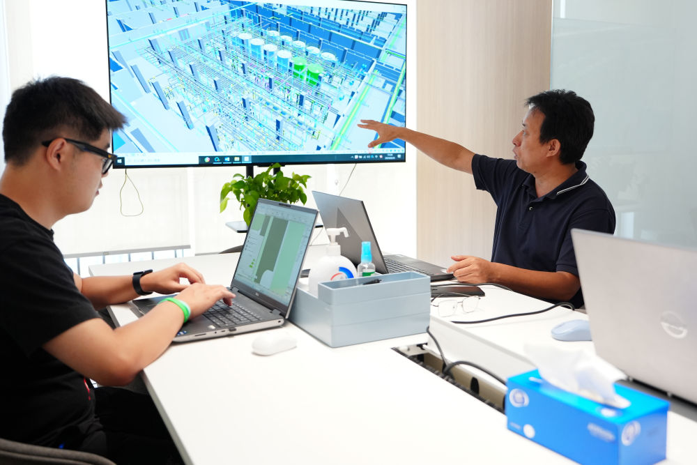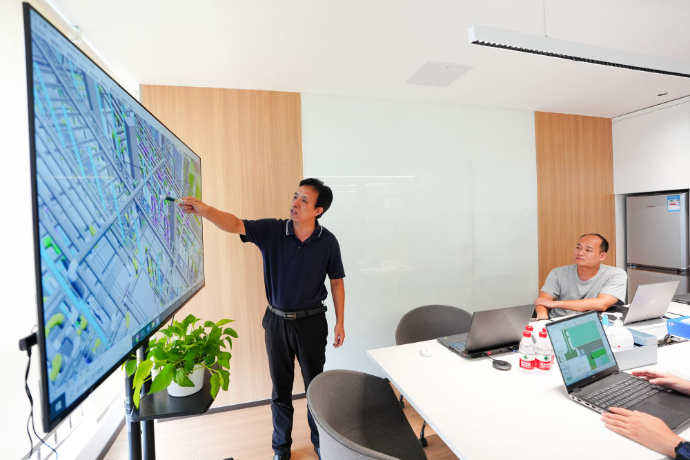 2024年8月26日,中国电子院工作人员利用数字孪生模型讨论某半导体项目纯水系统方案