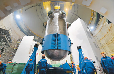 1月28日,华龙一号全球首堆、中核集团福清核电5号机组反应堆压力容器顺利吊装。林善传摄(新华社发)