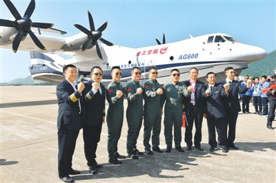 2017年12月24日,大型水陆两栖飞机“鲲龙”AG600完成首飞后,机组人员等与飞机合影留念。(新华社记者 梁 旭摄)
