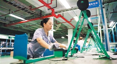 2017年11月1日,四川长虹多媒体整装生产线女班长唐世会在多媒体整装生产线上工作。(新华社记者 薛 晨摄)