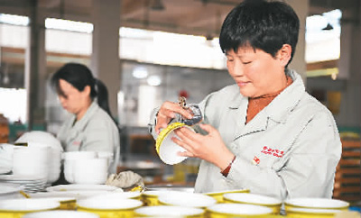 2017年10月31日,江西省景德镇红叶陶瓷一厂彩绘车间贴花工段工段长邱赛珍在为瓷器白胎贴花。(新华社记者 万 象摄)