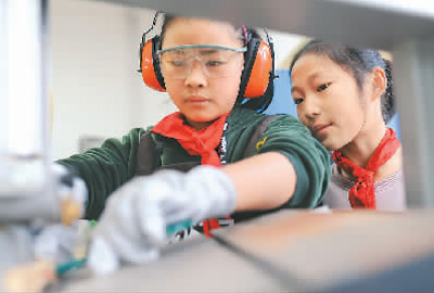 1月4日,山东省青岛市两名小学生在木艺手工小创客活动上,学习制作工艺品。(人民视觉 王海滨)
