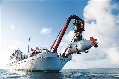2017年6月1日,在马里亚纳海沟作业区,“蛟龙”号载人潜水器离开“向阳红09”科学考察船缓缓进入水中。