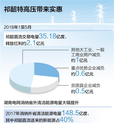 “今年除了上述企业外,参与电力市场化交易的其他电力用户,也能享受祁韶每度电便宜1分钱的普惠。”刘勇介绍,2018年1至5月,祁韶直流交易电量35.18亿度,释放红利约2.1亿元,重点优势企业通过跨省购电交易减负约0.6亿元;参与交易的贫困县企业已增至573家,减负约0.5亿元;其他参与交易的大工业、一般工商业用户减负约1亿元。