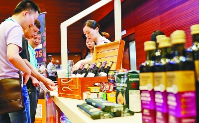 图为在进博会食品展商客商供需对接会上,参观者向展商工作人员咨询商品信息。 (新华社 发)