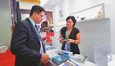 图为参观者在进博会世界贸易组织展台向工作人员咨询。 (新华社 发)
