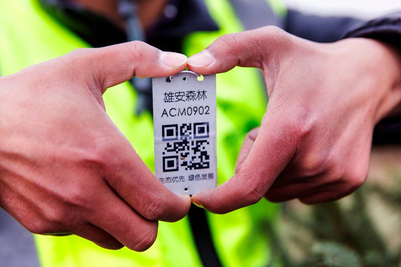 每棵苗木上都挂着一个带有二维码的铝制小标牌,上面写着“雄安森林”,“这是它们的专属身份证”,中交天航局雄安新区建设指挥部副指挥长胡保安博士说,“这个二维码链接着雄安森林大数据系统,通过它可查询苗木的树种、规格、位置、生长信息等,实现对苗木全生命过程监控”。