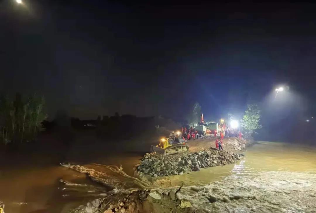由于土堤较窄,加之装有石料的自卸车反复碾压导致道路坑坑洼洼,一台大型反铲在用铲背夯实路基。中国安能前指专门安排了保通分队,以确保运送石料的车辆通过。 “现在最大的难题是右岸不断垮塌,左岸进占越快,龙口越窄水流速越大,右岸就垮塌得越快。”右岸指挥员、中国安能唐山救援基地指挥长刘其森一脸疲惫。25日凌晨一点,龙口一度只剩下4米多,但由于右岸裹头不停垮塌,截至25日6时,龙口仍有4米宽。中国安能一局有关负责人焦急地同鹤壁、浚县两级主要领导协商紧急应对措施,他们都全程坚守在大堤上一夜未合眼。经过紧急讨论,最终选择“双管齐下”。一方面,现场就地取材,用挖掘机将二十余颗大树、公交车等推入放置决口处,缓减水流速度。另一方面,采用三层钢筋笼、串接12个1立方钢筋笼进行护角。