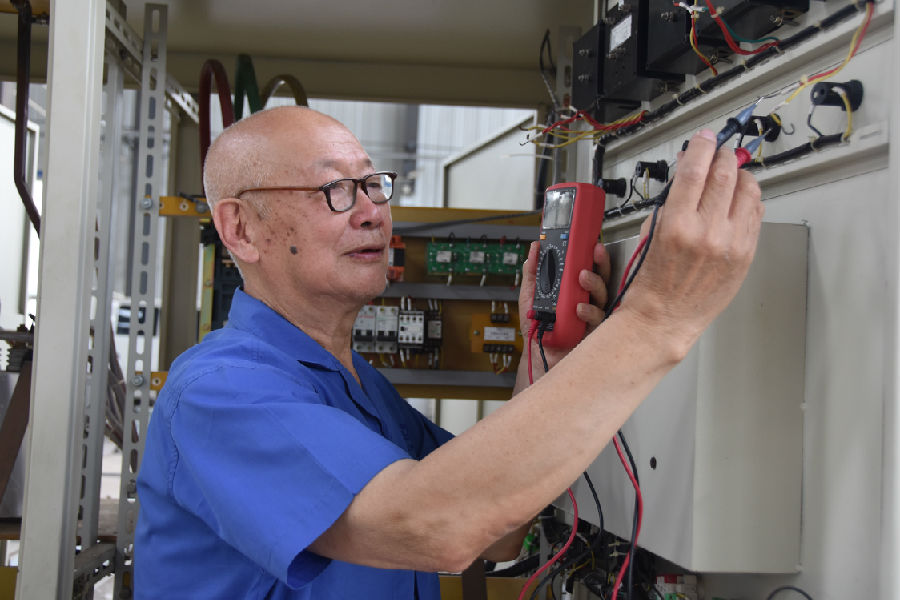 随着太谷区疫情得以有效控制,利民公司各分厂开始陆续恢复生产,需在短时间内完成9件某重点产品的生产,但关键设备直焊机组、辊压机组在搬迁后还未安装就位,受疫情影响,厂外设备调试人员和生产线操作人员无法进厂,在厂的维修人员均未参与过该设备的安装调试,致使相关工作无从下手,生产更是无法启动。听说这一消息后,曾参与过机组安装的庞滂坐不住了,他不顾双腿肿胀、身体不适,主动请缨加入到设备调试工作中,他的出现,给大家吃下了一颗“定心丸”。确定技术参数等相关数据,确保实测数据与图纸数据的一致性,是设备调试的首要工作。直焊机组电器线路有200多条,好似一张密密麻麻的“蜘蛛网”,肉眼难以区分,一旦混淆,连接错误将直接影响调试进度。庞师傅蹲在机台前,一根一根检测,在控制柜、执行元件之间来回穿梭,确定每条线路的作用,对损坏线路进行更换,并对调试好的线路进行编号。八十多岁的庞师傅常常一蹲就是好几个小时,一天下来腰都直不起来,本就肿胀的双腿更是迈不开步,但他依旧坚守在调试现场,既当指挥员,又做战斗员,全面摸排设备情况,制定调试方案,重新设计损坏部件。在他的指挥下,设备设施管理中心组织精兵强将对设备进行调试,机加分厂、农机配件分厂对零部件进行加工制作,物资供应中心抓紧采购缺件,各相关单位密切配合,各种零部件在最短时间内就位,保障了设备调试工作顺利展开。