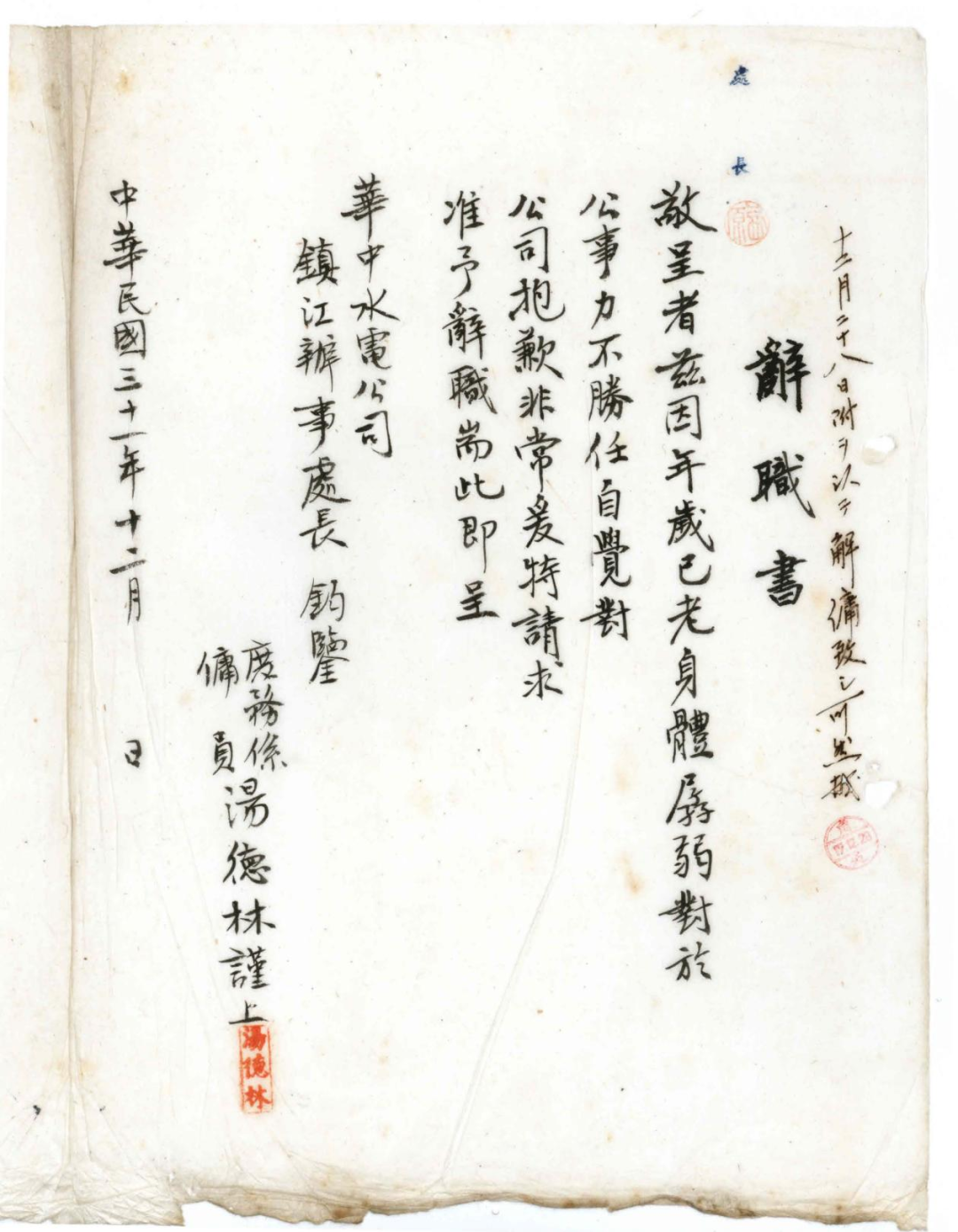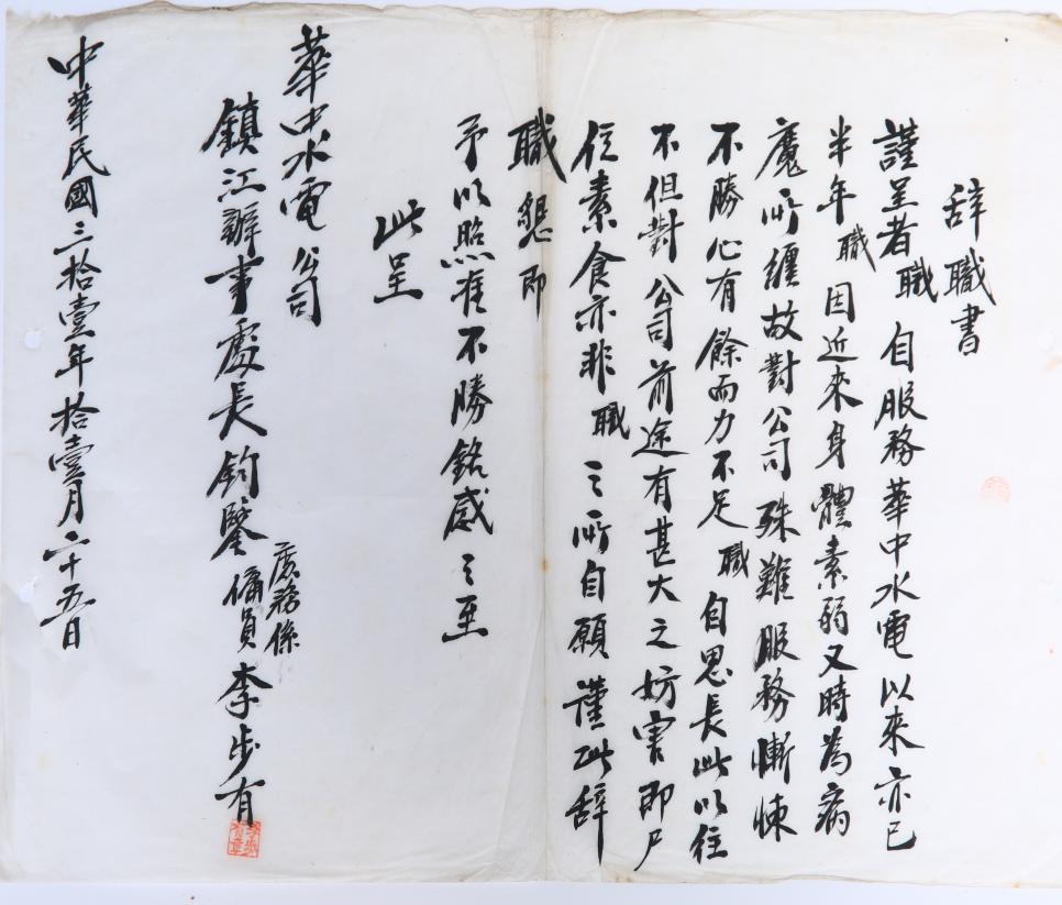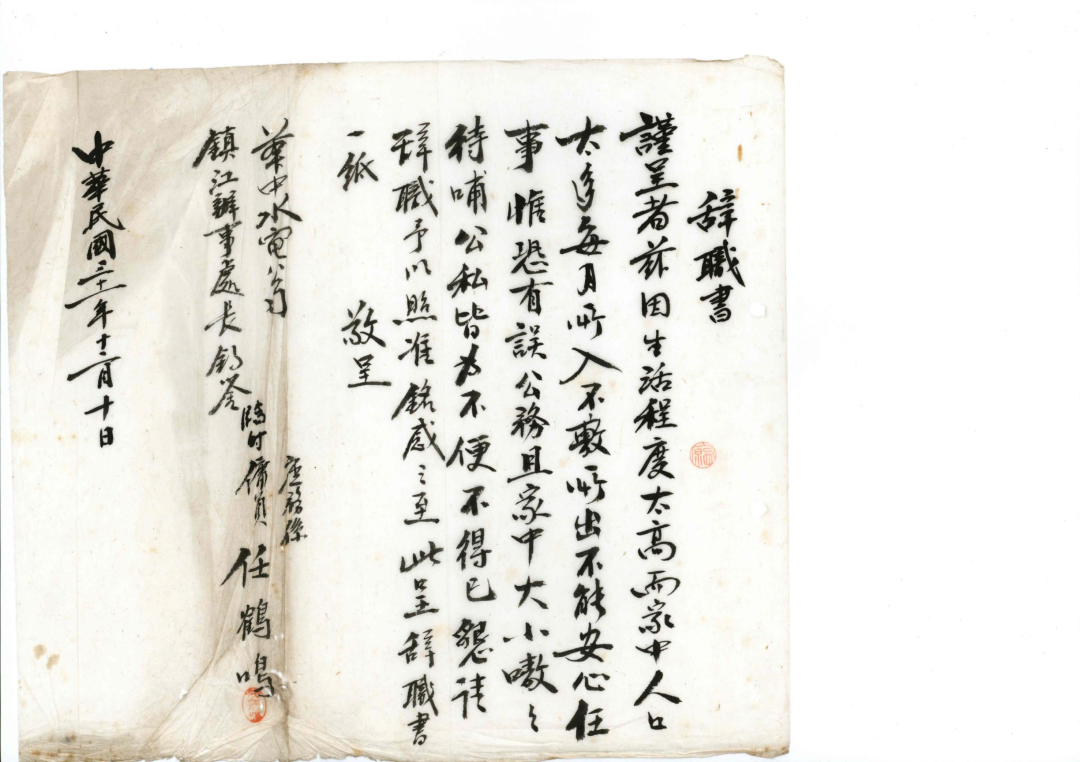 从1941年至1944年,镇江地下党组织多次发动水电公司员工辞职抗争,给敌人的军工生产造成了巨大破坏。目前仅存的20封辞职信,是当年轰轰烈烈的辞职运动的珍贵缩影,更是电力工人在党的带领下开展反侵略爱国运动的历史见证。