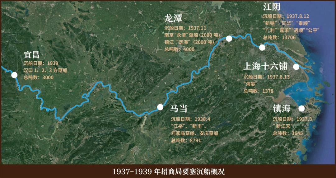 1937年,抗日战争爆发之初,招商局共有大小船只53艘,计86380总吨。几次大规模的沉船塞港行动后,招商局共沉船24艘,其中江海大轮与大型趸船18艘,计3.45万总吨。