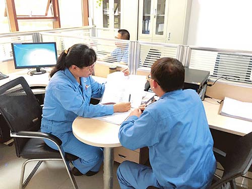 山西钢科技术研发部办公室内,雷爱民(左)正在为她的团队人员分析数据。