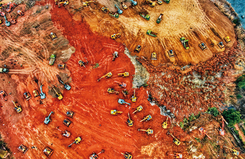 为确保按时完成建设任务,火神山医院建设现场机械设备火力全开,24小时不间断施工。不同于当年北京小汤山医院建在平原,超过7万平方米的火神山医院临水而建,地面高差最大处近10米,既有建筑物要拆除,还有大片芦苇荡要清淤、鱼塘要回填,土方开挖、砂石换填量近40万立方米,而这些场地平整任务必须在两天之内完成。图为火神山医院场地平整施工现场航拍。