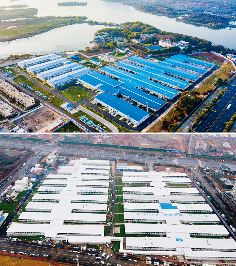 仅用10天建成占地面积7万平方米、建筑面积3.4万平方米、床位1000张的火神山医院,仅用12天建成占地面积22万平方米、建筑面积7.99万平方米、床位1600张的雷神山医院,都堪称“世界奇迹”,充分彰显了中国共产党领导和我国社会主义制度的巨大政治优势。上图为建成后的火神山医院。下图为建成后的雷神山医院。