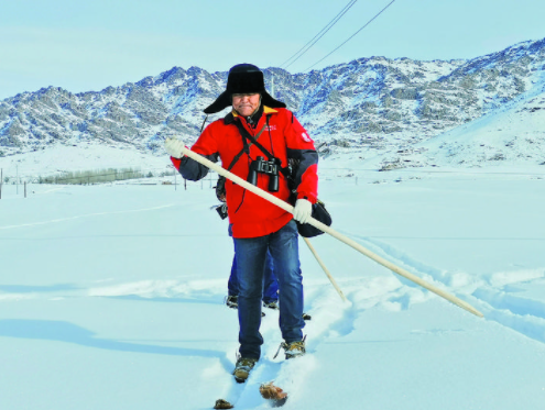 “冬季的汗德尕特普遍温度达零下25摄氏度,雪深可达1米多。我们供电所巡线用的交通工具很特殊,既不是汽车,也不是马匹。而是一个‘老古董’——毛皮滑雪板。”在积雪及腰的道路中,车辆无法前行,孛旭鸿便将车停下,一边从检修车辆的后备箱拿出毛皮滑雪板递给巴图,一边介绍着当地的情况。二人熟练地将它穿戴起来,继续前行。