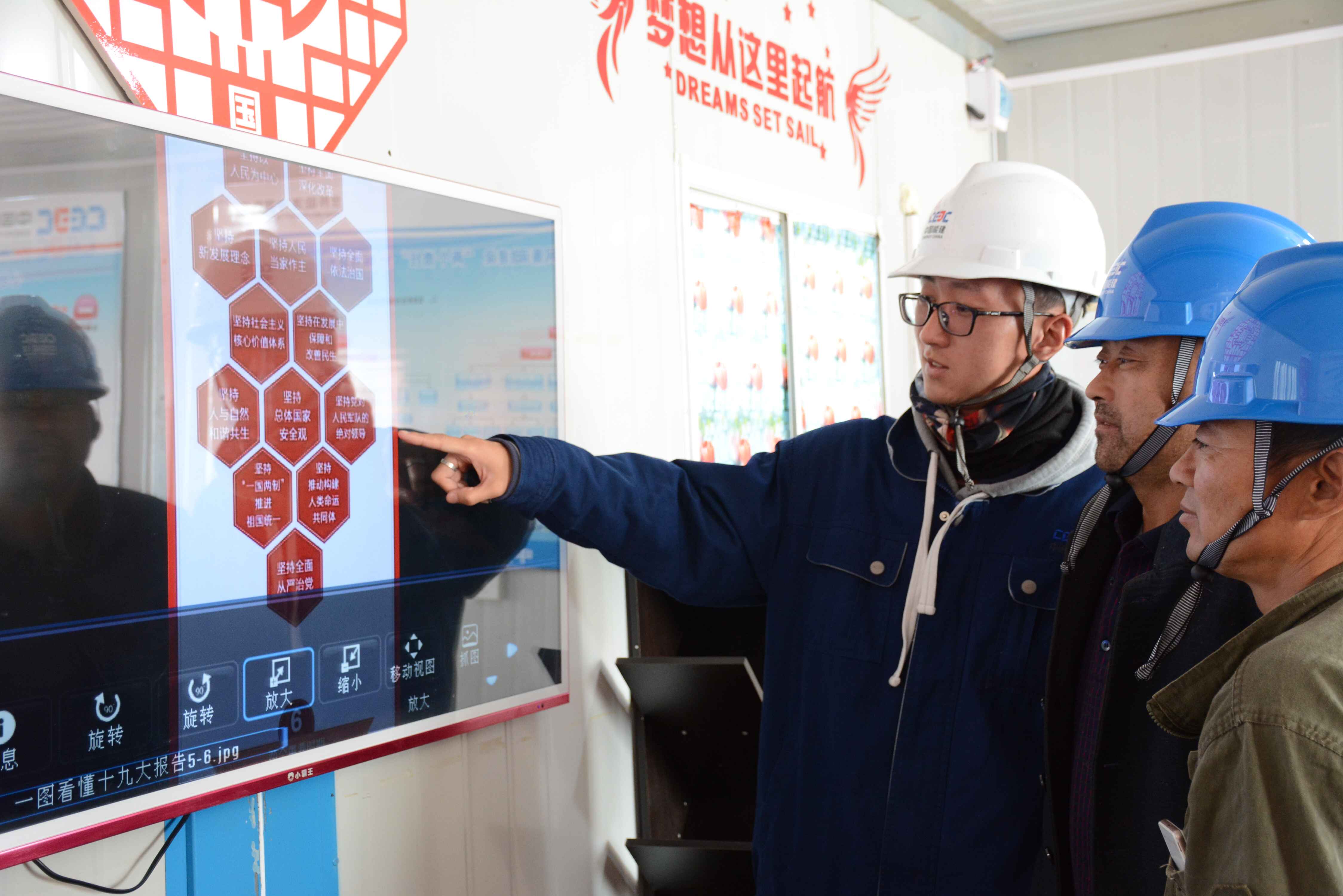 技术员张蒙蒙在党员活动室内为工友讲党的十九大报告