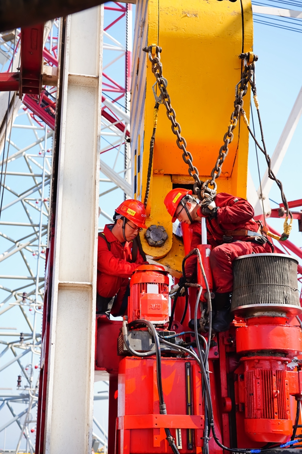 机舱、泵舱、钻台、振动筛房……一圈转下来通常30分钟。别小看这30分钟,还真能发现大问题。有一次巡检到钻台,正在进行钻进作业,刘海鹏发现顶驱发出的声音和以往不太相同,主轴上还有油迹。凭借多年的工作经验,他立刻找来现场作业总监,要求停工检查。一番排查,发现顶驱的碟片弹簧及旋转头密封损坏,带损作业会有很大风险。