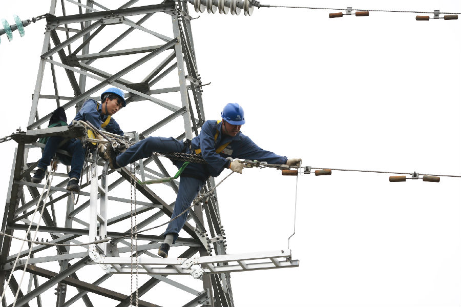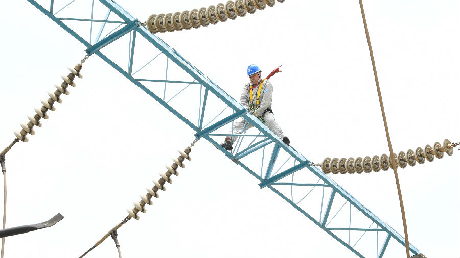 龙福刚使用自己改良过的安全工具器,在杆塔上开展输电线路检修维护工作。(卢关文 摄)