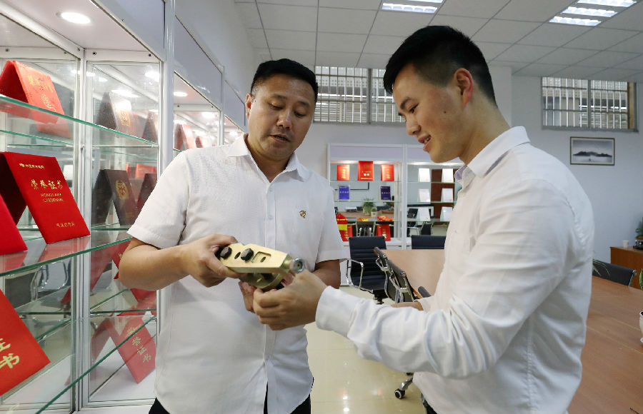 龙福刚在与同事分享交流创新成果技术。(卢关文 摄)