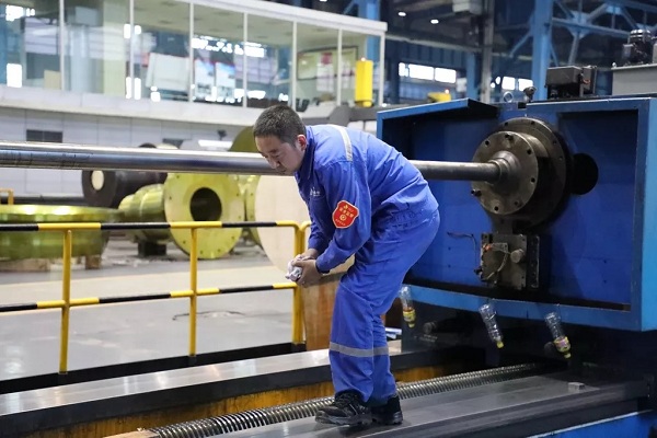 一袭蓝衣,双目凝神,“刀客”单指轻点,启动数千万元的“豪车”——长达56米的大型数控钻床。十多米长的钻杆上,挂着一座刀盘,各类刀具角度各异,刚搭上银色的钢锭就不停抖动。