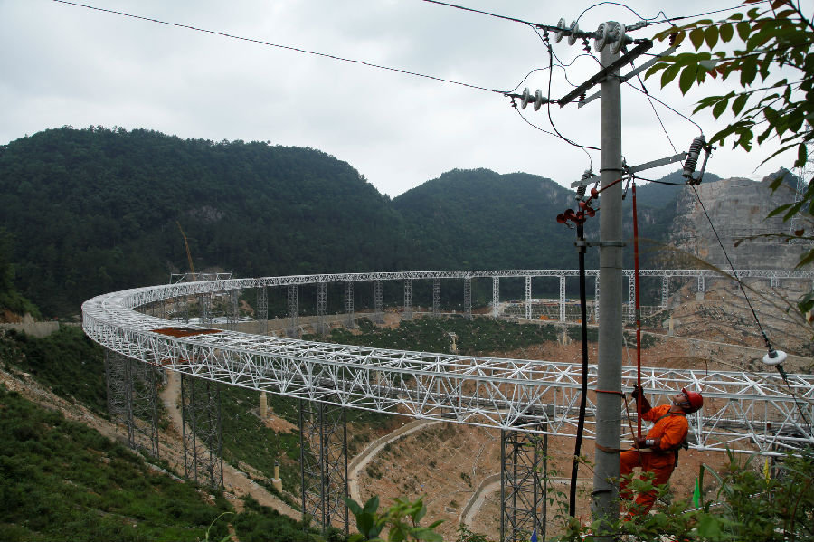 2008年,南方电网 “天眼供电服务队”正式挂牌成立。2011年,在“天眼”建设初期,“大窝凼”的电力只能满足10千瓦的照明用电需求,不能满足“天眼”工程3000千瓦的项目正式用电负荷,一条35千伏克度变电站至“天眼”专用变电站的18.25公里输电线路(含8.9公里地下电缆)的接入迫在眉睫。由于喀斯特洼地不适于用挖掘机械进行作业,于是,烈日炎炎下,团队决定利用工器具,徒手挖掘电缆沟。