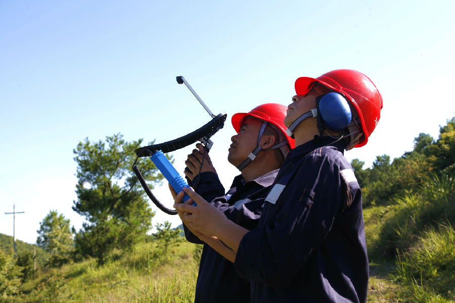南方电网“天眼供电服务队”运用超声波测试仪对“天眼”配套输电线路35千伏克射线进行检测。陈竞 摄