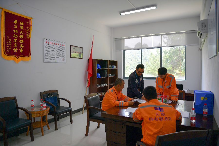 “天眼”基地距离供电所29公里,车程需要25至30分钟。随着一批又一批的天文观测成果不断涌现,可靠的电力支撑和快速的服务响应显得尤为重要。2016年,在“寸土寸金”的“天眼”综合楼内部,“天眼”管理部门为服务队特设了一间“天眼供电小家”。