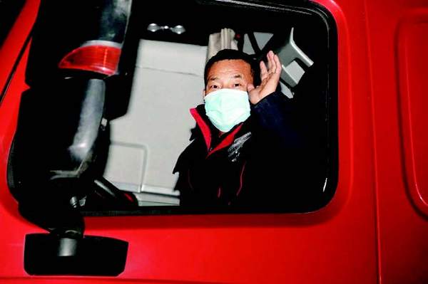 由于只有一条通道能够出入工地,四面八方来此的运输车辆多而密集,此时,在杨春良和鲁邦春的车之前,已经排起了长长的车队,两人只能在卡口处按顺序排队等待卸货。或许是按时到达了目的地的缘故,车里的气氛轻松起来,两人拿出自带的干粮,密闭车窗,褪下口罩开始充饥。鲁邦春拿出手机对杨春良说:“我们录段视频吧, 车队里谁穿成这样送过货啊,要留个纪念。”