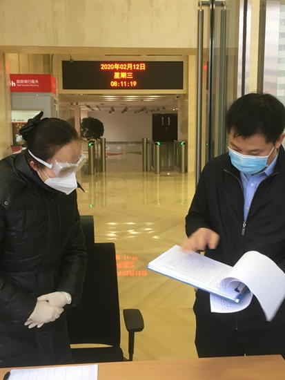 两位保安戴着医用外科口罩和橡胶手套,拿着测温仪,站在办公楼入口处,逐一检测入楼人员的体温。体温检测正常,才予以入内。