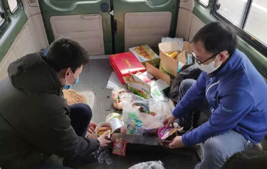不到半个小时,一支5人的专业运输队伍迅速集结完毕,由袁平生带队。在车队运输车辆上,除了有标配的酒精、体温计、防护服、口罩等防疫物资外,还有后勤部门紧急为车队采购配备的高原“爱心套餐”:防寒军大衣、红景天、氧气罐、葡萄糖口服液,以及来回10余天的方便食品等。