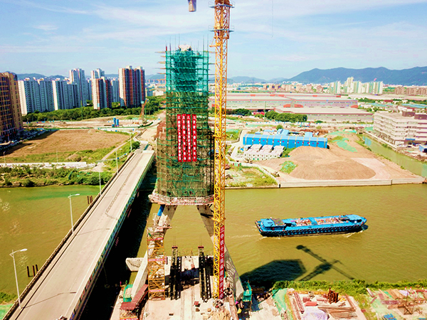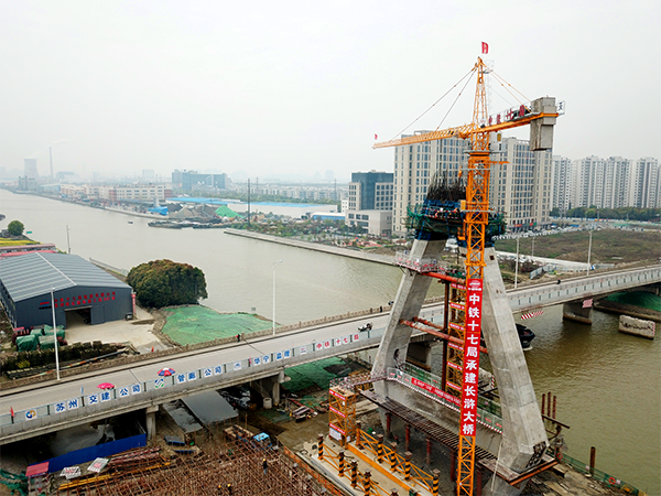 中铁十七局上海轨道公司苏州长浒大桥主塔封顶。(张扬 摄)