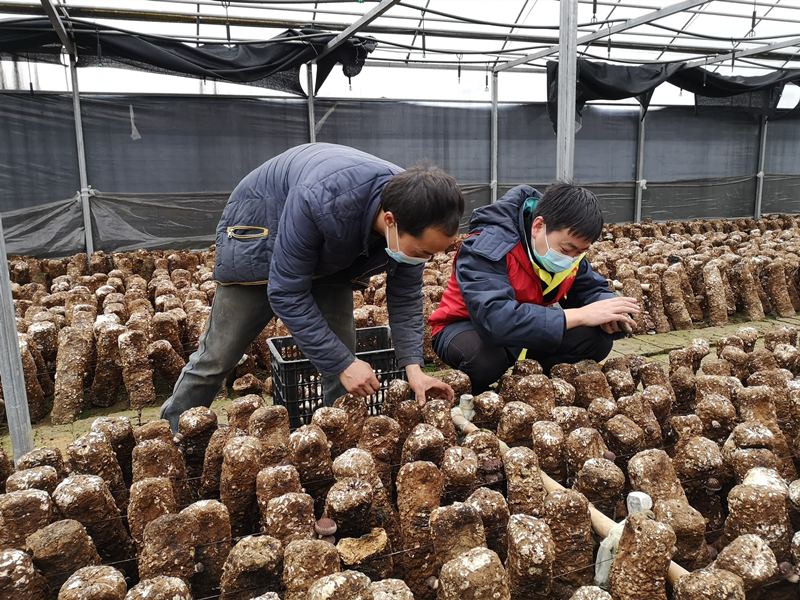 疫情防控期间,杨洪涛和贫困户一起在食用菌种植基地采摘食用菌。倪妮摄