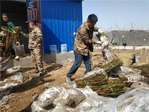 农时不等人。开春之后,防疫宣传、卡点执守等疫情防控工作依然让王磊和驻村工作队忙得不可开交,但春耕生产、蔬菜大棚、果树苗圃也是今年的头等大事。“目前喀什地区林果面积缺口约300万亩,今年我们要重点发展壮大村集体建设20亩果树苗圃,栽种樱桃、桃子、苹果各5万棵,自己扦插8万株石榴,一年后这些树苗卖出,预计可增加村集体收入140万元,到时村集体有钱了,就能更好地服务村民,增强村民的归属感和幸福感”,王磊已经算好了这笔经济账。
