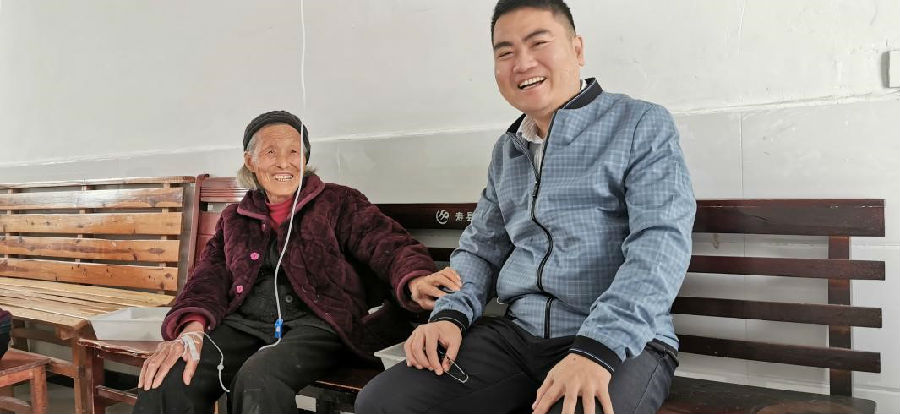 陶三宝在新修建的尚庙卫生室与村民大娘亲切交谈