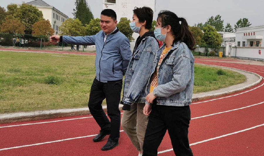 陶三宝在梨树学校新建成的塑胶跑道上与学校师生交流