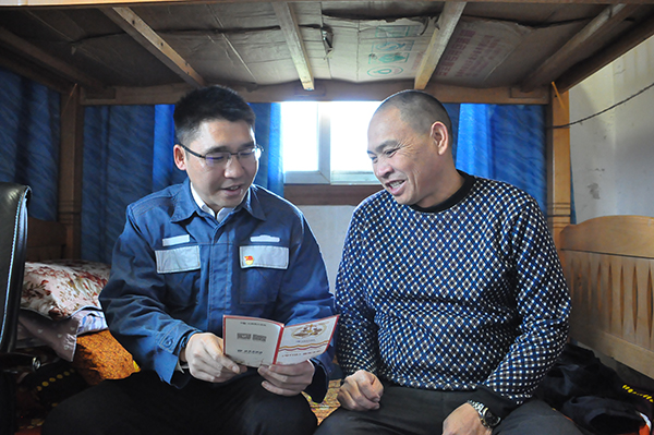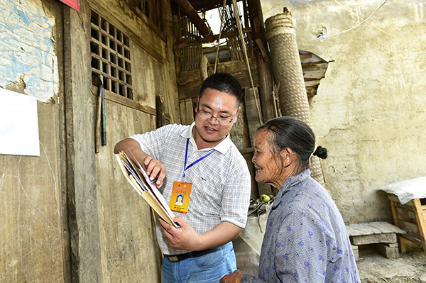 严召波走访贫困户,了解他们日常生活面临的难题,向他们宣传党的政策。