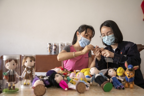 梁晓君到贫困户家中走访,了解其自制手工艺品情况。(甄一飞 摄)